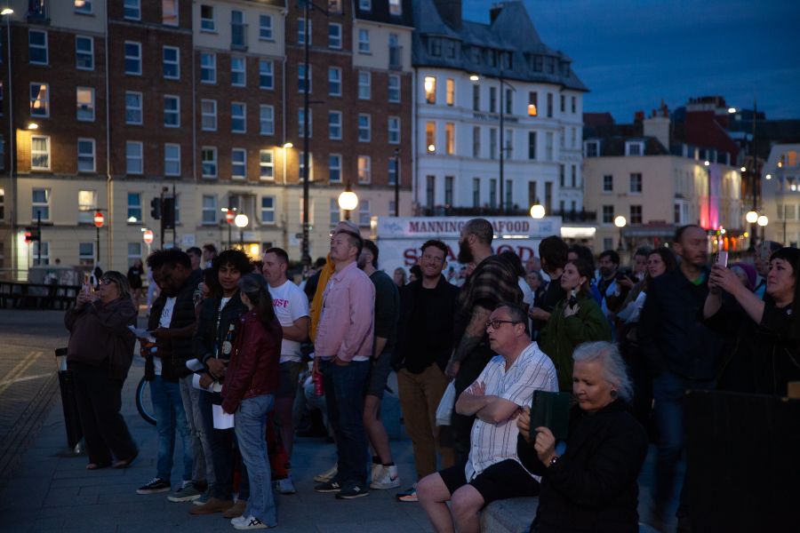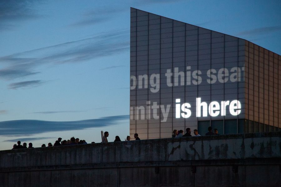 Onlookers gathered to watch the projection which presented the outcome of the poetry workshop, alongside a reworking of the original to create a second summary piece in the mode of concrete poetry.