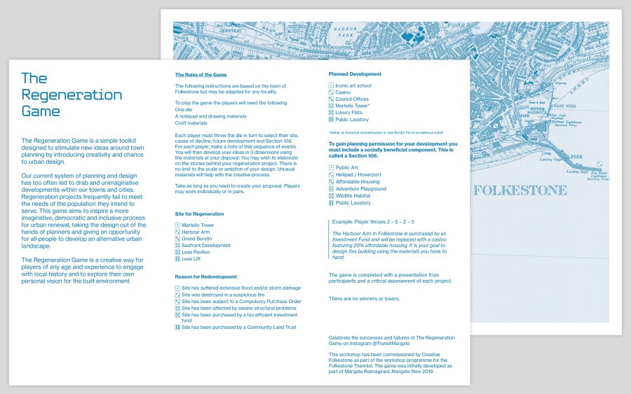 The Regeneration game was first developed as one of the public workshop elements of our project, Margate Reiminagined for the Margate Festival 2019. Since then we were selected to deliver a Folkestone edition as part of the Folkestone Triennial in 2021, and held a re-run of the Margate edition at the Margate School in 2023.